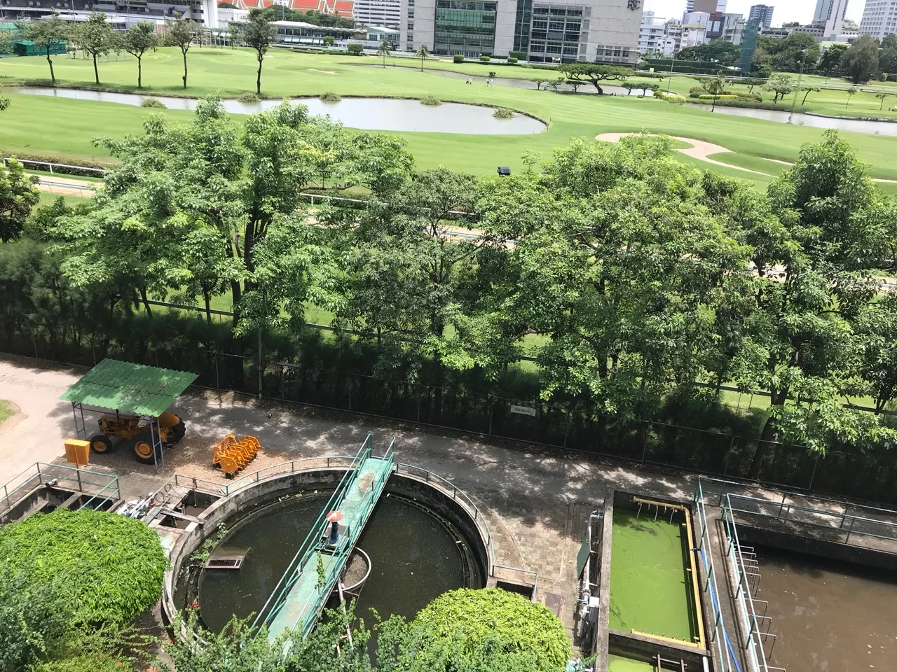 Wastewater treatment plant next to exclusive golf course. Also typical Bangkok style. Taken from elevated train (BTS).